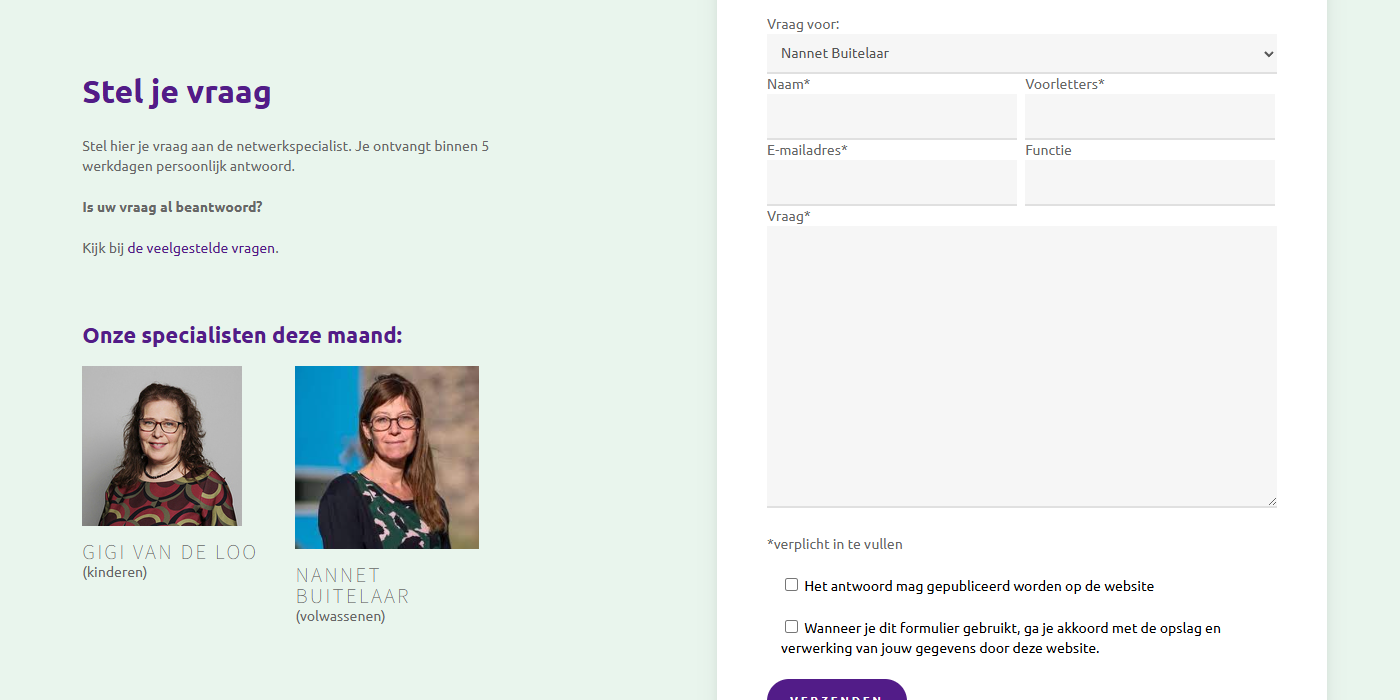 Let op: Onze stichting richt zich op zorgprofessionals die werken met mensen met ADHD. Heb je zelf ADHD en vragen hierover? Helaas kunnen wij je daar niet persoonlijk bij helpen. Voor vragen en ondersteuning verwijzen we je onder andere door naar onze lijst met professionals bij jou in de buurt of naar de belangenvereniging Impuls & Woortblind voor mensen die ADHD hebben en voor hun verwanten: https://www.
